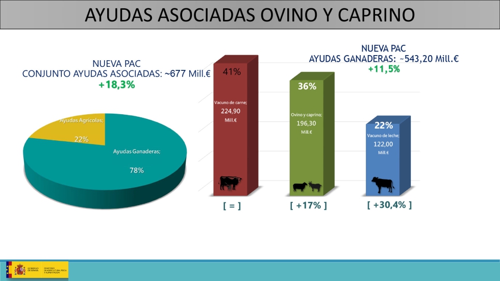 Respecto a las ayudas asociadas, el 78% de estas van destinadas a ganadería. En este nuevo periodo de PAC en el que nos encontramos, entendiendo que el sector ovino y caprino siempre ha sido un sector vulnerable y que necesitaba un apoyo mayor, se ha incrementado el presupuesto de las ayudas asociadas al ovino y caprino en un 17% hasta los 196,3 millones de euros.