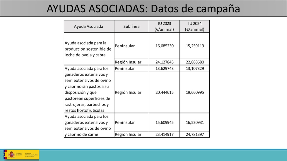El ovino y el caprino tiene tres ayudas asociadas diferentes: para la producción de leche, para los ganaderos extensivos y semiextensivos de ovino y caprino de carne y para aquellos ganaderos que pastorean superficies de rastrojeras, barbechos y restos hortofrutícolas porque no tienen pastos a su disposición (esta última es compatible con cualquiera de las otras dos).
