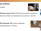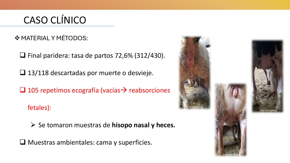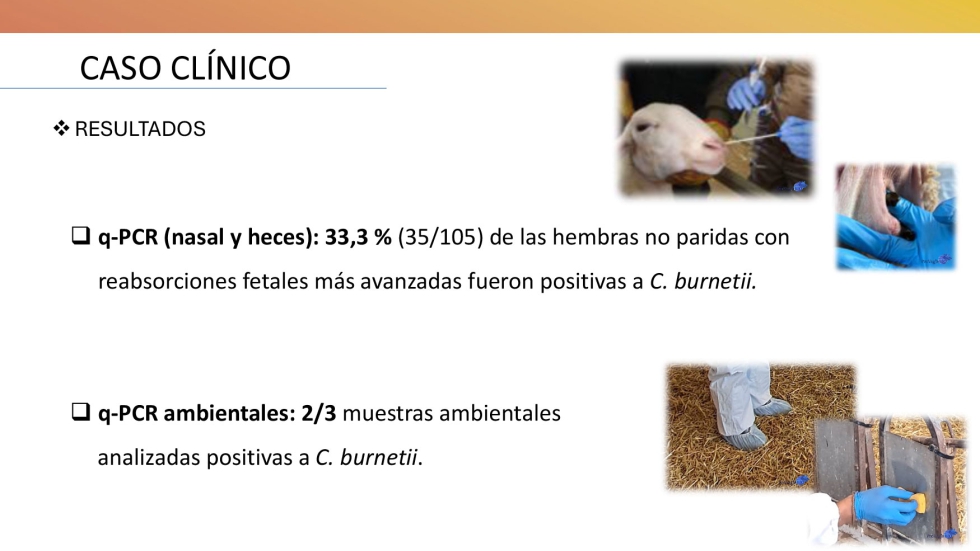 De esas cinco muestras, todos los animales fueron negativos, tanto a Neospora como a Border y en dos de los cinco animales hubo seropositividad a fiebre Q. Al final de la paridera, la tasa de partos que se obtuvo fue de un 72%, es decir, de las 430 ovejas que tenían que haber parido, solo parieron 312. Y hubo 13 animales de las 118 que no parieron que se habían muerto o se habían vendido a lo largo del periodo de preparto. Y de las 105 que quedaban, justo cuando había acabado ya el periodo de parto, se repitió la ecografía y las 105 estaban vacías y en alguna de ellas se podían ver reabsorciones fetales. En algunos casos de las corderas, las reabsorciones se produjeron muy pronto. En estos 105 animales se propuso tomar muestras y se tomaron muestras tanto nasales como de heces de todas ellas. Y, al mismo tiempo, se tomaron a nivel de explotación muestras ambientales, tanto de cama como de superficie.