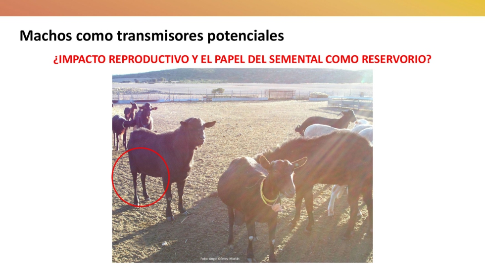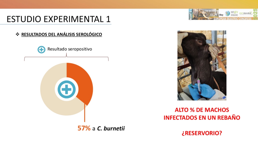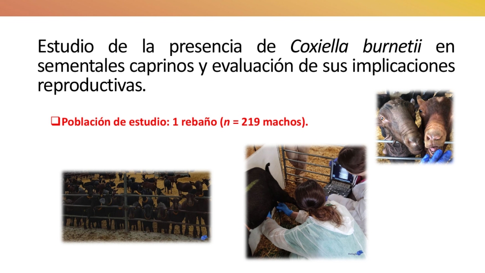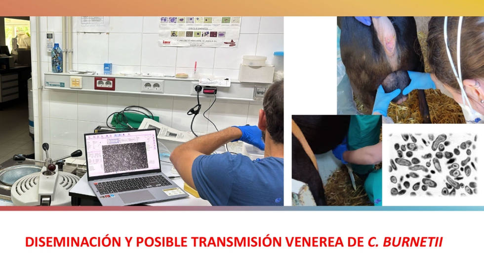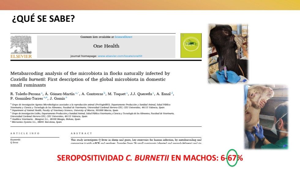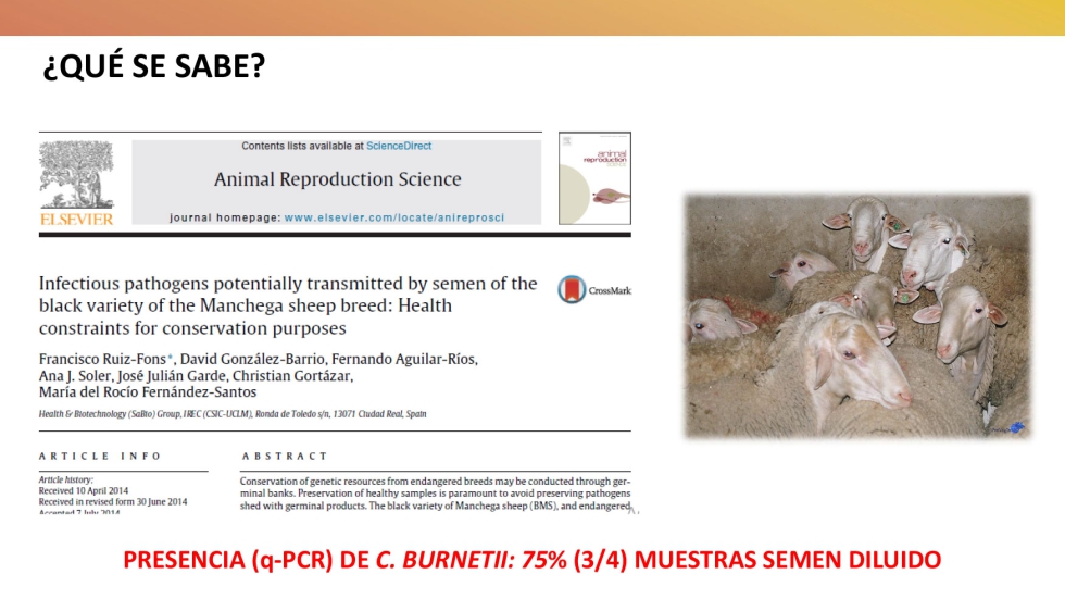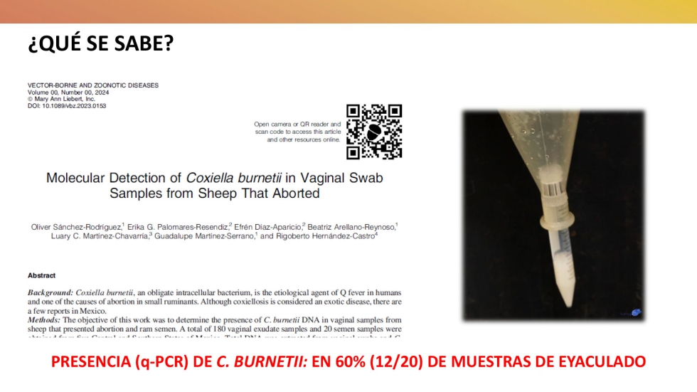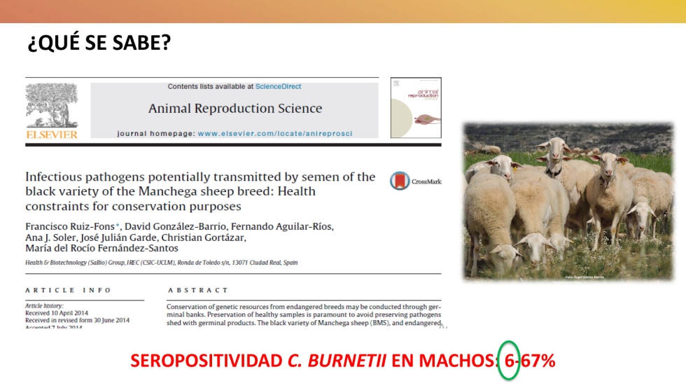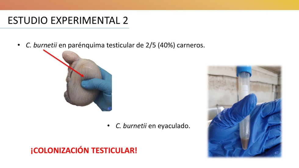 Respecto a la presencia de Coxiella burnetii en semen, se conocen solamente dos estudios en todo el mundo. En uno se detectó la presencia de Coxiella burnetii por QPCR en el 60% de muestras de eyaculado. En otro estudio se detectó en el 75% de muestras, pero en este caso fueron de semen diluido. Al tener tan poca información a nivel de semen, del Grupo ProVaginBIO llevó a cabo un segundo estudio en el que, además del semen, se quiere comprobar si se podría detectar en otras localizaciones anatómicas, como pueden ser el parencular o el epididimo de los machos, y en una explotación que había sufrido un brote de fiebre Q. Se detectó Coxiella burnetii en el 40% de los carneros estudiados y también se detectó la presencia en el eyaculado de uno de los machos que tenía el parénquima testicular afectado, con una baja calidad espermática. Por lo tanto, se puede concluir que la presencia de Coxiella burnetii en el semen podría ser debido, además de una posible contaminación del prepucio o de las camas, a que el animal pueda estar afectado y que esté teniendo una colonización a nivel reproductivo. También podemos concluir que los sementales pueden ser portadores de la enfermedad con una gran capacidad de diseminación y también que tengan un posible papel en la transmisión venérea de la enfermedad en el rebaño.