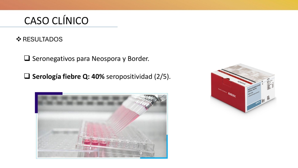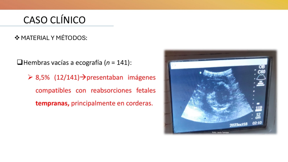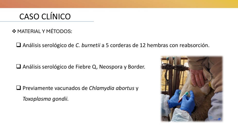 En concreto, de este rebaño de 1.700 animales, el caso clínico ocurrió en un lote de 571 ovejas que se pusieron a cubrir, de las cuales 230 eran corderas. En todas se pusieron implantes de melatonina. A los 40 días de haber retirado los machos, se realizó diagnóstico de gestación y el 8,5% de las ovejas que se pusieron a cubrir presentaban imágenes compatibles con procesos de reabsorción fetal temprana. Se tomaron cinco muestras de suero de esos 12 animales que estaban presentando esa sintomatología y se hizo un análisis serológico y de fiebre Q, Neospora y Border. No se buscó ni clamidias ni Toxoplasma porque los animales estaban vacunados con vacuna viva.