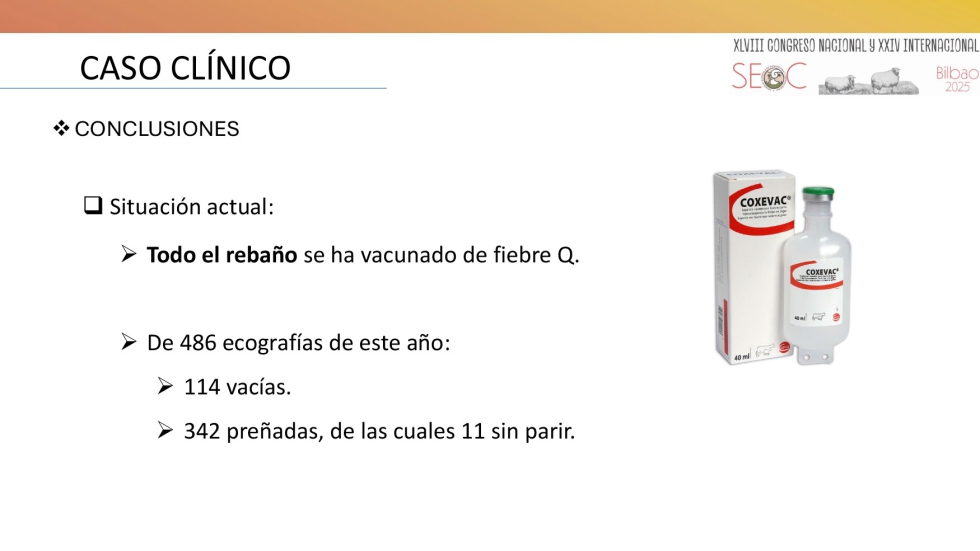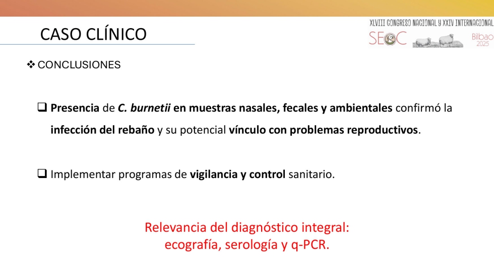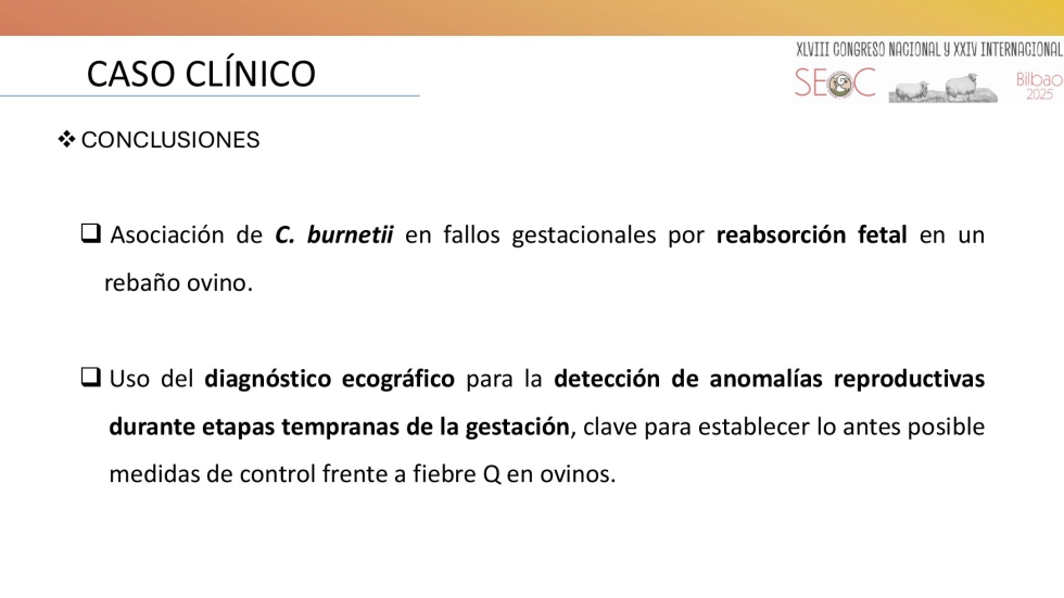 Como conclusiones de este caso clínico, se ha comprobado la asociación de Coxiella burnetii en fallos gestacionales por reabsorción fetal en un rebaño ovino. También se constató la importancia del diagnóstico ecográfico para la detección de anomalías reproductivas durante etapas tempranas de gestación, lo que clave para establecer lo antes posible medidas de control frente a fiebre Q. Debe haber un diagnóstico integral con ecografía, serología y q-PCR. Además, la presencia de Coxiella burnetii en muestras nasales, fecales y ambientales confirmó la infección del rebaño y su potencial vínculo con problemas reproductivos.