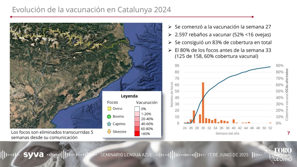 Los primeros focos que se confirmaron fueron de ovino y después ya comenzaron los casos de bovino. El número de focos que apareció se fue multiplicando, pero según se fue incrementando el porcentaje de vacunación, los focos fueron disminuyendo radicalmente. A final de año, con fecha de 30 de diciembre, se había conseguido un 83% de vacunación en toda Cataluña, pero en las zonas donde había focos se llegó casi al 90%. Se observó que, quince días después de aplicar la vacunación, bajan mucho los nuevos casos.