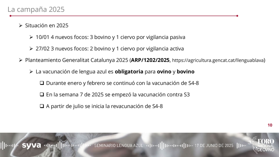 La Generalitat ha tomado la decisión de continuar con la campaña de vacunación obligatoria de lengua azul en 2025 para ovinos y bovinos mayores de tres meses. Tras quedarnos en un 83% de vacunación en 2024, entre enero y febrero del presente año se finalizó la vacunación para el serotipo 4 y el serotipo 8, para proceder después con la revacunación.