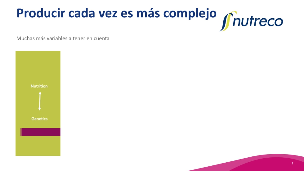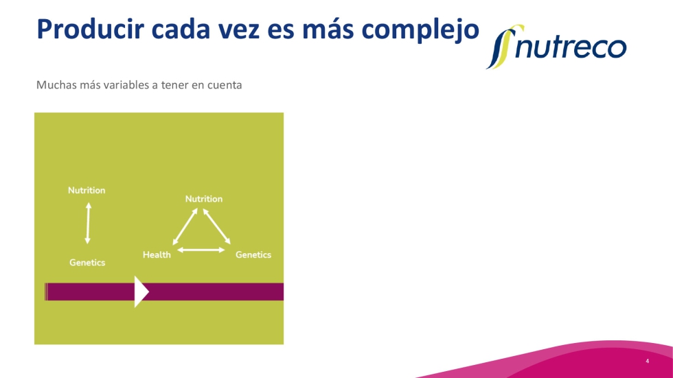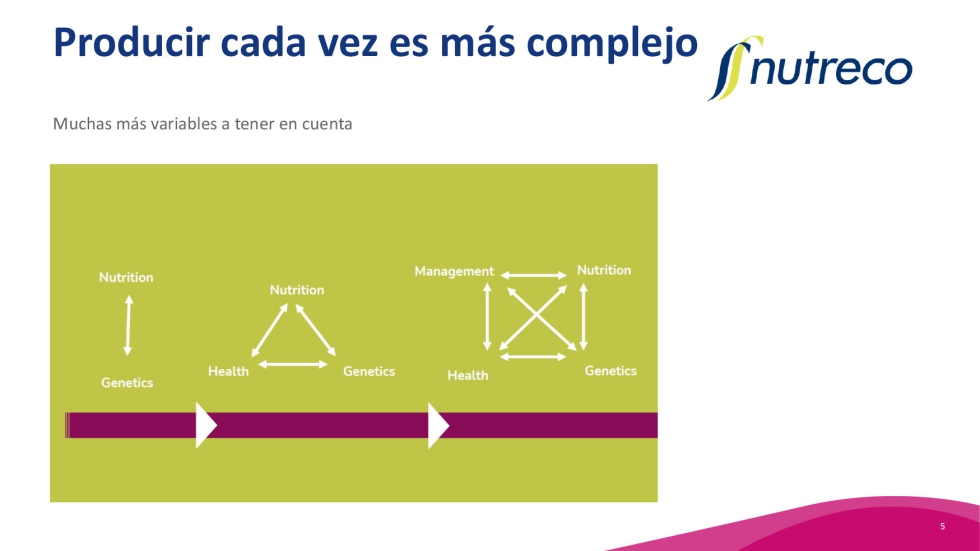 En la actualidad, se deben tener en cuenta un gran número de variables. Además de la nutrición y la genética, que ya se tenían en cuenta hace alrededor de un siglo, a medida que las explotaciones han ido creciendo, los mercados exigían un poco más, y a estas dos variables se sumó un tercer aspecto: la sanidad. Por lo tanto, había que tener los animales en ciertas condiciones para seguir avanzando en eficiencia. A medida que se seguía avanzando, se sumó la cuarta pata, el manejo. Ya parecía que con estos cuatro pilares se podía controlar la producción. Sin embargo, producir ahora, como decíamos antes, es mucho más complejo ya que se deben tener en cuenta muchas más variables procedentes de la legislación y la presión social: que estén libres de antibióticos, que sean sostenibles, que se tenga en cuenta el bienestar animal… Esto provoca que cualquier problema que se tenga en la granja sea mucho más complejo de solucionar. No es cuestión de cambiar una sola variable, ya que todas están interconectadas.