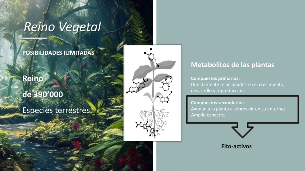 El reino vegetal tiene posibilidades ilimitadas. Dentro de una especie o superespecie, la planta tiene diferentes componentes que la hacen única y diferente del resto. Las plantas desarrollan unos metabolitos, que son los metabolitos primarios, que le ayudan a crecer, desarrollarse, reproducirse… Y también hay unos metabolitos secundarios, que son los que le ayudan a la planta a sobrevivir y a defenderse del medio.