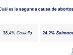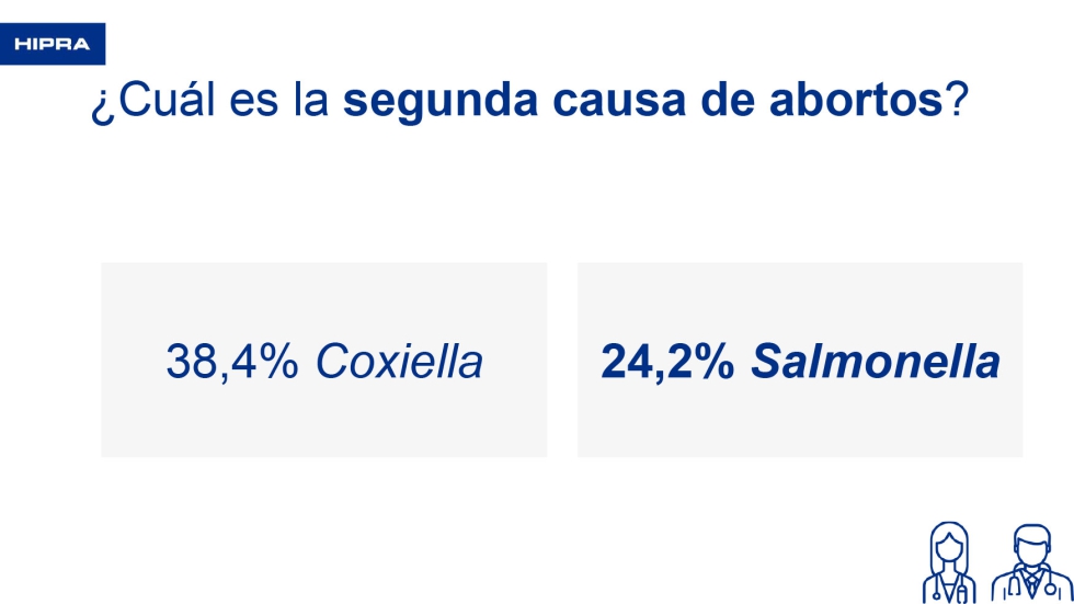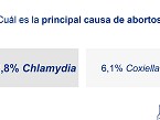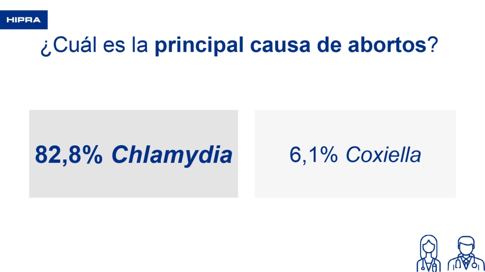 La primera pregunta que se hizo a los veterinarios fue cuál es la principal causa de abortos. Un 82,8% de los veterinarios respondió Chlamydia abortus y un 6,1% dijo que Coxiella burnetii. Cuando se preguntaba por la segunda causa de abortos, un 39,4% respondió Coxiella burnetii y un 24,2% dijo Salmonella. Por lo tanto, se confirma que las clamidias son la principal causa de abortos en las explotaciones.