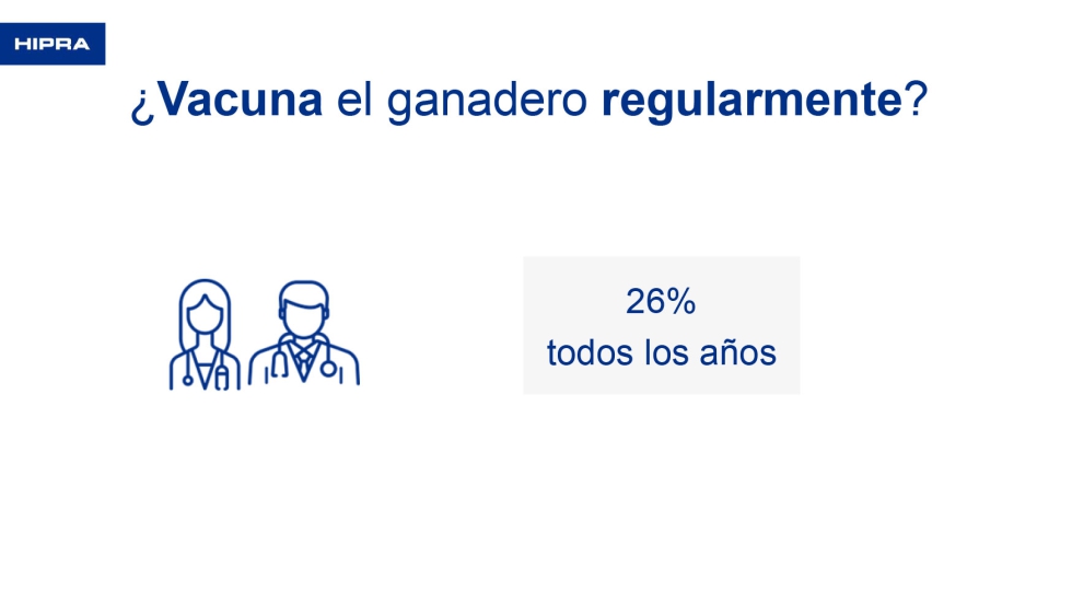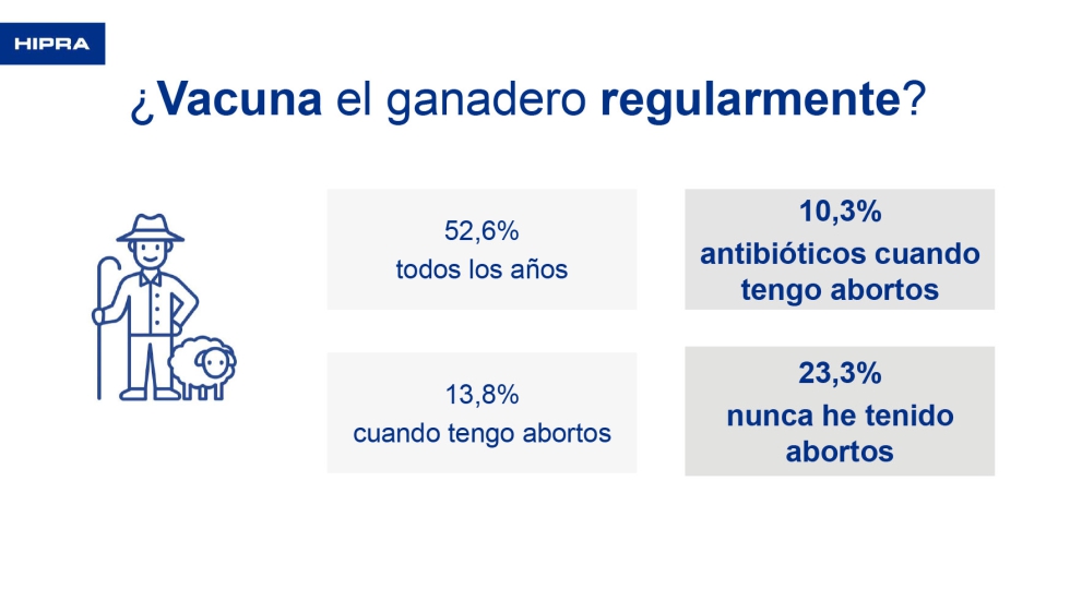 Al preguntarle a los veterinarios si sus ganaderos vacunaban regularmente, únicamente el 26% lo hacía todos los años. Si se le pregunta al ganadero, la respuesta es diferente. Dice que vacunan todos los años el 52,6% y cuando se tienen abortos el 13,8%. Estos datos pueden estar condicionados porque a la encuesta respondieron más ganaderos de ovino de leche que de carne. Un 10,3% reconoce que utiliza antibióticos cuando se tienen abortos y un 23,3% dijo que nunca había tenido un problema de abortos.