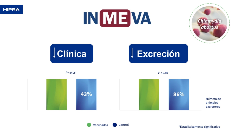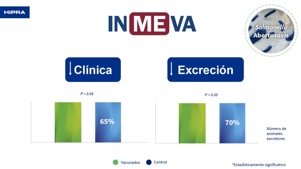 Los datos muestran que disminuye la clínica en un 74% y la excreción en un 55% de los animales. Además, hay que tener en cuenta que INMEVA es una vacuna combinada, por lo que reduce el 55% de la clínica y el 58% de la excreción para Salmonella abortusovis.