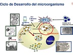 El ciclo de desarrollo del microorganismo comienza con la llegada de una forma infecciosa llamada cuerpo elemental, que es muy resistente en el ambiente, esta forma se une a la superficie de la célula y entra dentro de una vesícula. El siguiente paso es la transformación a un cuerpo reticular, que es una estructura más grande y no es infectiva, pero sí es metabólicamente activa, por lo que es capaz de multiplicarse por fisión binaria. En la siguiente fase, en unas 48 o 72 horas, se vuelve a condensar en cuerpos elementales, que pueden salir al exterior de la célula.