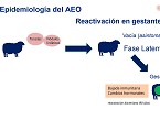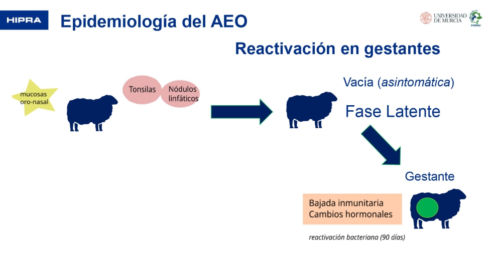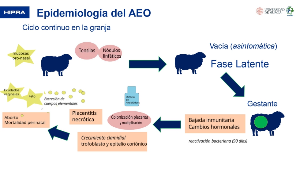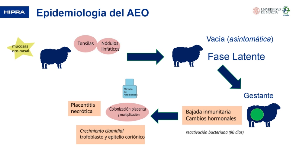 Cuando la oveja pasa a ser gestante, a partir de los 90 y 100 días de gestación, se producen unos cambios hormonales importantes por la producción de progesterona para poder proteger la gestación, por lo que se inhibe la respuesta de tipo celular. Se produce una bajada inmunitaria y una reactivación bacteriana. Las clamidias llegan a la placenta y la colonizan, con una placentitis que puede provocar un aborto o un parto prematuro. En el aborto se producen una excreción masiva de clamidias por el exudado vaginal y los fetos, lo que puede provocar la infección de los animales.