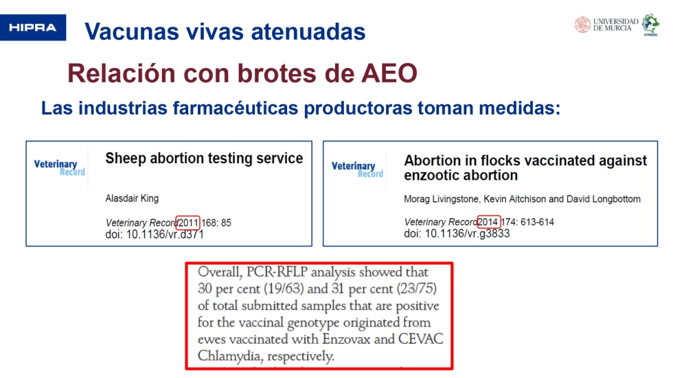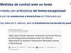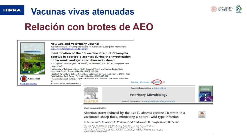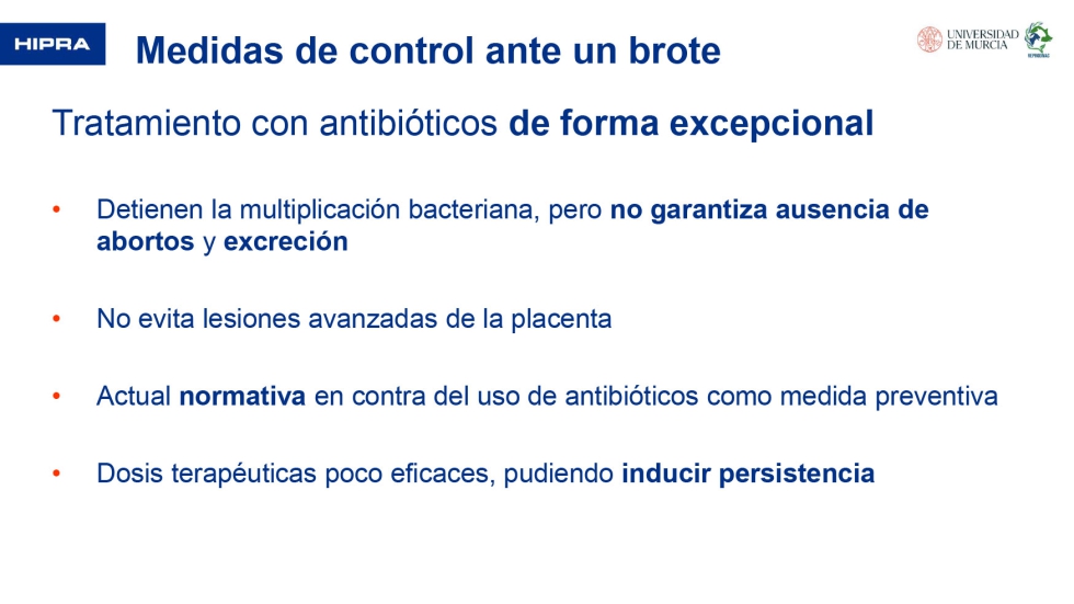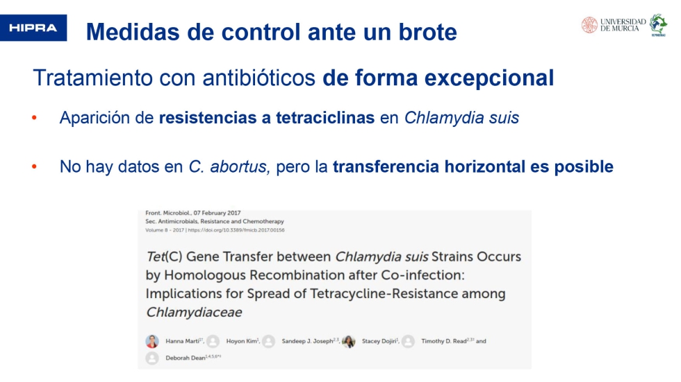 Cuando tenemos abortos podemos tratar con antibióticos de forma excepcional los animales que van a parir. Los antibióticos detienen la multiplicación bacteriana, pero no garantiza la ausencia de abortos y la excreción. Los antibióticos no son recomendables en la primera etapa de la gestación ni en animales no gestantes, porque el antibiótico no podrá llegar dentro de las células. Además, no se evitan las lesiones avanzadas de la placenta, ya que no existe la regeneración placentaria. Por otro lado, la actual normativa está en contra del uso de antibióticos como medida preventiva. Si las dosis son bajas, pueden inducir persistencia. Además, están apareciendo resistencias a tetraciclinas en Chlamydia suis. No hay datos en C. abortus, pero la transferencia horizontal es posible cuando hay infecciones comunes.