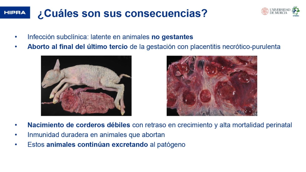 Esta bacteria causa una infección subclínica, que es latente en animales no gestantes. Una vez que el animal está gestante, a partir del tercer mes de gestación, la bacteria pasa a la placenta y produce lesiones con focos necróticos en los cotiledones, lo que provoca finalmente abortos o partos prematuros con un retraso importante en el crecimiento de los corderos y alta mortalidad perinatal.