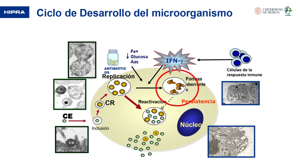 Por su parte, las células de la respuesta inmune producen gamma interferón, al igual que otros factores estresantes como alguno antibióticos, produce la aparición de unas formas aberrantes. Así, la célula se queda con la infección latente, pudiendo estar semanas o meses. Cuando no hay gamma interferón o no se trata con antibióticos, se reactiva la infección y se pasa de nuevo a una forma productiva de cuerpos elementales infecciosos.
