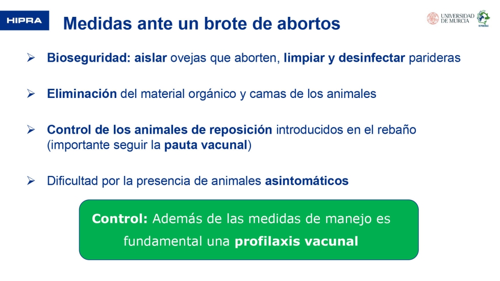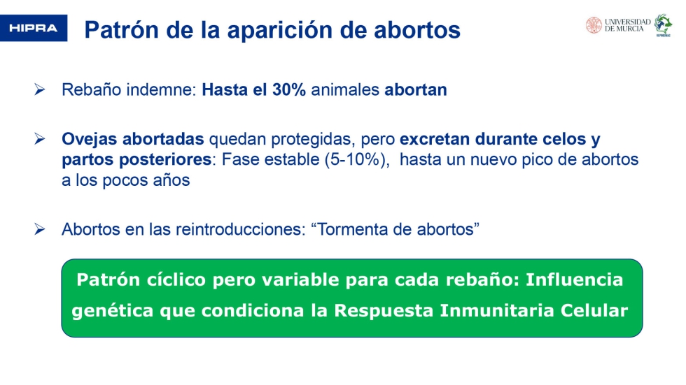 Si el rebaño es indemne y no ha habido casos en el pasado, puede haber brotes muy significativos, con abortos de hasta un 30% de las ovejas gestantes. Las ovejas abortadas quedan protegidas, pero excretan durante celos y partos posteriores, por lo que contaminan las instalaciones del rebaño. Se produce una fase estable, con abortos entre el 5% y el 10%, hasta un nuevo pico de abortos a los pocos años. Es más visible cuando se realizan reintroducciones en los rebaños, lo que puede provocar una tormenta de abortos.
